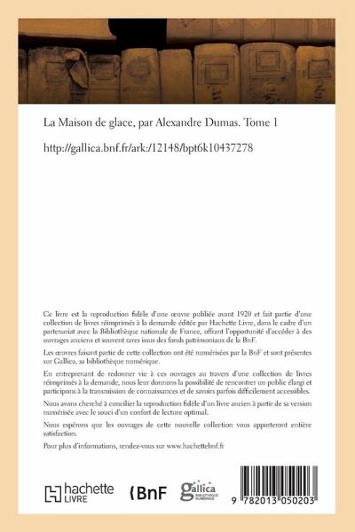 La Maison de glace, par Alexandre Dumas. Tome 1 Date de l'édition originale: 1860 Le présent ouvrage s'inscrit dans une politique de conservation patrimoniale des ouvrages de la littérature Française mise en place avec la BNF. HACHETTE LIVRE et la BNF proposent ainsi un catalogue de titres indisponibles, la BNF ayant numérisé ces oeuvres et HACHETTE LIVRE les imprimant à la demande. Certains de ces ouvrages reflètent des courants de pensée caractéristiques de leur époque, mais qui seraient aujourd'hui jugés condamnables. Ils n'en appartiennent pas moins à l'histoire des idées en France et sont susceptibles de présenter un intérêt scientifique ou historique. Le sens de notre démarche éditoriale consiste ainsi à permettre l'accès à ces oeuvres sans pour autant que nous en cautionnions en aucune façon le contenu. Pour plus d'informations, rendez-vous sur www.hachettebnf.fr