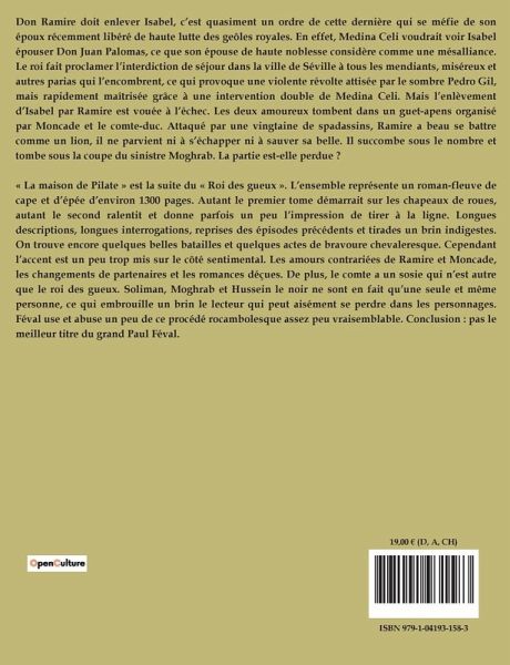 Don Ramire doit enlever Isabel, c¿est quasiment un ordre de cette dernière qui se méfie de son époux récemment libéré de haute lutte des geôles royales. En effet, Medina Celi voudrait voir Isabel épouser Don Juan Palomas, ce que son épouse de haute noblesse considère comme une mésalliance. Le roi fait proclamer l¿interdiction de séjour dans la ville de Séville à tous les mendiants, miséreux et autres parias qui l¿encombrent, ce qui provoque une violente révolte attisée par le sombre Pedro Gil, mais rapidement maîtrisée grâce à une intervention double de Medina Celi. Mais l¿enlèvement d¿Isabel par Ramire est vouée à l¿échec. Les deux amoureux tombent dans un guet-apens organisé par Moncade et le comte-duc. Attaqué par une vingtaine de spadassins, Ramire a beau se battre comme un lion, il ne parvient ni à s¿échapper ni à sauver sa belle. Il succombe sous le nombre et tombe sous la coupe du sinistre Moghrab. La partie est-elle perdue ? « La maison de Pilate » est la suite du « Roi des gueux ». L¿ensemble représente un roman-fleuve de cape et d¿épée d¿environ 1300 pages. Autant le premier tome démarrait sur les chapeaux de roues, autant le second ralentit et donne parfois un peu l¿impression de tirer à la ligne. Longues descriptions, longues interrogations, reprises des épisodes précédents et tirades un brin indigestes. On trouve encore quelques belles batailles et quelques actes de bravoure chevaleresque. Cependant l¿accent est un peu trop mis sur le côté sentimental. Les amours contrariées de Ramire et Moncade, les changements de partenaires et les romances déçues. De plus, le comte a un sosie qui n¿est autre que le roi des gueux. Soliman, Moghrab et Hussein le noir ne sont en fait qüune seule et même personne, ce qui embrouille un brin le lecteur qui peut aisément se perdre dans les personnages. Féval use et abuse un peu de ce procédé rocambolesque assez peu vraisemblable. Conclusion : pas le meilleur titre du grand Paul Féval.