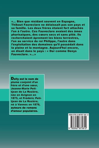 ... Bien que résidant souvent en Espagne, Thibaut Fauveclare ne délaissait pas son pays et sa famille. Les deux frères étaient fort attachés l'un à l'autre. Ces Fauveclare avaient des âmes pharisaïques, des c¿urs secs et sans pitié. Ils recherchaient âprement les biens terrestres, l'un au service du roi Philippe, l'autre dans l'exploitation des domaines qu'il possédait dans la plaine et la montagne. Aujourd'hui encore, on disait dans le pays : Dur comme Denys Fauveclare. ...