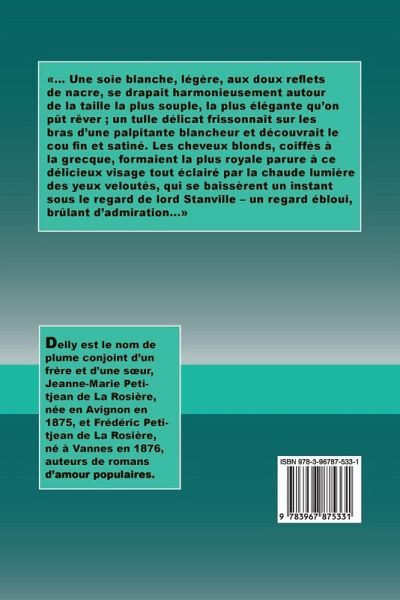 ... Une soie blanche, légère, aux doux reflets de nacre, se drapait harmonieusement autour de la taille la plus souple, la plus élégante qu'on pût rêver ; un tulle délicat frissonnait sur les bras d'une palpitante blancheur et découvrait le cou fin et satiné. Les cheveux blonds, coiffés à la grecque, formaient la plus royale parure à ce délicieux visage tout éclairé par la chaude lumière des yeux veloutés, qui se baissèrent un instant sous le regard de lord Stanville - un regard ébloui, brûlant d'admiration...