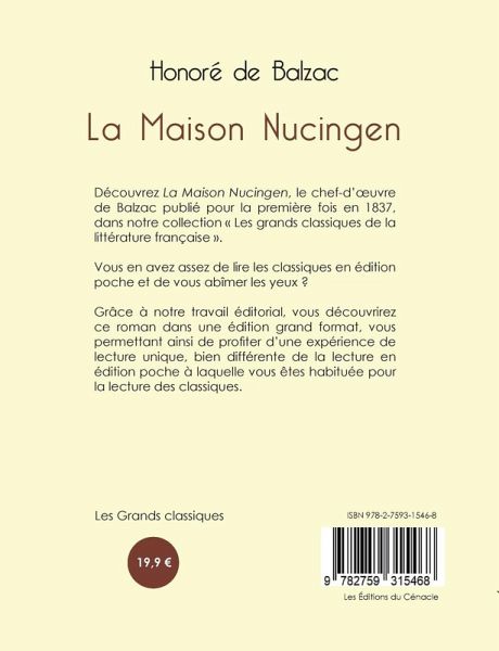 Découvrez La Maison Nucingen, le chef-d¿¿uvre de Balzac publié pour la première fois en 1837, dans notre collection « Les grands classiques de la littérature française ». Vous en avez assez de lire les classiques en édition poche et de vous abîmer les yeux ? Grâce à notre travail éditorial, vous découvrirez ce roman dans une édition grand format, vous permettant ainsi de profiter d¿une expérience de lecture unique, bien différente de la lecture en édition poche à laquelle vous êtes habituée pour la lecture des classiques.