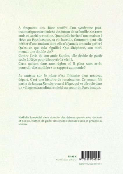 À cinquante ans, Rose souffre d'un syndrome post-traumatique et articule sa vie autour de sa famille, ses rares amis et sa chère routine. Quand elle hérite d'une maison à Héyo au Pays basque, sa vie bascule. Comment peut-elle hériter d'une maison dont elle n'a jamais entendu parler ? Qu'est-ce que cela signifie ? Que Stéphane, son mari, menait une double vie ? Contre l'avis de son amie Sandra, elle décide de partir seule à Héyo pour découvrir la vérité. Cette maison dans une région où il pleut sans arrêt, pourrait-elle modifier son rapport au monde ? La maison sur la place c'est l'histoire d'un nouveau départ. C'est une histoire de renaissance. Ce roman fait partie de la saga Rendez-vous à Héyo, qui se déroule dans un village extraordinaire niché au coeur du Pays basque.
