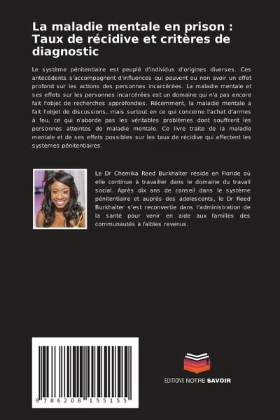 Le système pénitentiaire est peuplé d'individus d'origines diverses. Ces antécédents s'accompagnent d'influences qui peuvent ou non avoir un effet profond sur les actions des personnes incarcérées. La maladie mentale et ses effets sur les personnes incarcérées est un domaine qui n'a pas encore fait l'objet de recherches approfondies. Récemment, la maladie mentale a fait l'objet de discussions, mais surtout en ce qui concerne l'achat d'armes à feu, ce qui n'aborde pas les véritables problèmes dont souffrent les personnes atteintes de maladie mentale. Ce livre traite de la maladie mentale et de ses effets possibles sur les taux de récidive qui affectent les systèmes pénitentiaires.