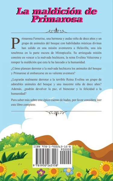 Primarosa Fernetise, una hermosa y audaz niña de doce años y un grupo de animales del bosque con habilidades místicas divinas han salido en una misión aventurera a Helavilla, una isla tenebrosa en la parte oscura de Mistopicalia. Su arriesgada misión consiste en vencer a la malvada hechicera, la reina Evelina Velecrona y romper la maldición que esta le ha lanzado a la humanidad. ¿Cómo planean derrotar a la malvada hechicera los animales del bosque y Primarosa al embarcarse en su valiente aventura? ¿Lograrán realmente derrotar a la terrible Reina Evelina un grupo de adorables animales del bosque y una inocente niña de doce años? Además, ¿podrán devolver la paz, el bienestar y la felicidad a la humanidad? Para saber más sobre este épico cuento de hadas, por favor considera leer este libro completo. BEST FICTION BOOK FOR CHILDREN AND TEENS. THIS BOOK TEACHES TRUE FRIENDSHIP, COURAGE, AND MORAL VALUES! Click this link to watch Primrose's Curse book trailer on Youtube. For more details, see www.vikipublishing.com