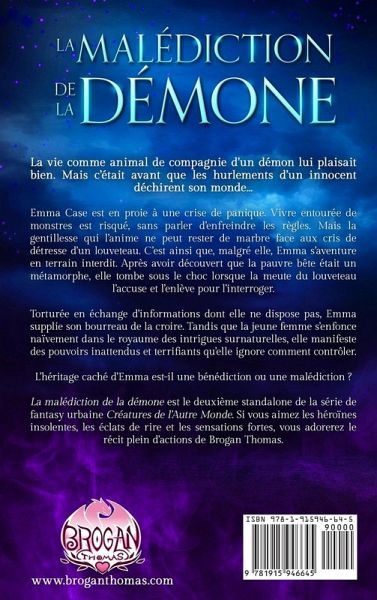 La vie comme animal de compagnie d'un démon lui plaisait bien. Mais c'était avant que les hurlements d'un innocent déchirent son monde... Emma Case est en proie à une crise de panique. Vivre entourée de monstres est risqué, sans parler d'enfreindre les règles. Mais la gentillesse qui l'anime ne peut rester de marbre face aux cris de détresse d'un louveteau. C'est ainsi que, malgré elle, Emma s'aventure en terrain interdit. Après avoir découvert que la pauvre bête était un métamorphe, elle tombe sous le choc lorsque la meute du louveteau l'accuse et l'enlève pour l'interroger. Torturée en échange d'informations dont elle ne dispose pas, Emma supplie son bourreau de la croire. Tandis que la jeune femme s'enfonce naïvement dans le royaume des intrigues surnaturelles, elle manifeste des pouvoirs inattendus et terrifiants qu'elle ignore comment contrôler. L'héritage caché d'Emma est-il une bénédiction ou une malédiction ? La malédiction de la démone est le deuxième standalone de la série de fantasy urbaine Créatures de l'Autre Monde. Si vous aimez les héroïnes insolentes, les éclats de rire et les sensations fortes, vous adorerez le récit plein d'actions de Brogan Thomas. Achetez aujourd'hui La malédiction de la démone pour combattre le feu par le feu !