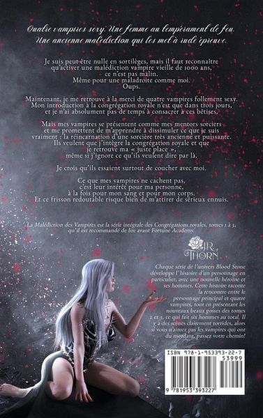 Illustrations intérieures en couleur ! Quatre vampires sexy. Une femme au tempérament de feu. Une ancienne malédiction qui les met à rude épreuve. Je suis peut-être nulle en sortilèges, mais il faut reconnaître qu'activer une malédiction vampire vieille de 1000 ans, ce n'est pas malin. Même pour une maladroite comme moi. Oups. Maintenant, je me retrouve à la merci de quatre vampires follement sexy. Mon introduction à la congrégation royale n'est que dans trois jours, et je n'ai absolument pas de temps à consacrer à ces bêtises. Mais mes vampires se présentent comme mes mentors sorciers et me promettent de m'apprendre à dissimuler ce que je suis vraiment : la réincarnation d'une sorcière très ancienne et puissante. Ils veulent que j'intègre la congrégation royale et que je retrouve ma juste place , même si j'ignore ce qu'ils veulent dire par là. Je crois qu'ils essaient surtout de coucher avec moi. Ce que mes vampires ne cachent pas, c'est leur intérêt pour ma personne, à la fois pour mon sang et pour mon corps. Et ce frisson redoutable risque bien de m'attirer de sérieux ennuis. La Malédiction des Vampires est la série intégrale des Congrégations royales, tomes 1 à 3, qu'il est recommandé de lire avant Fortune Academy. Chaque série de l'univers Blood Stone développe l'histoire d'un personnage en particulier, avec une nouvelle héroïne et ses hommes. Cette histoire raconte la rencontre entre le personnage principal et quatre vampires, tout en présentant les nouveaux beaux gosses des tomes 2 et 3, ce qui fait six hommes au total. Il y a des scènes clairement torrides, alors si vous n'aimez pas les vampires qui ont du mordant, passez votre chemin !