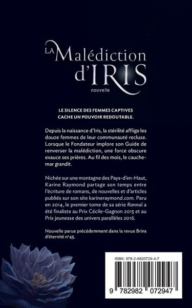 Le silence des femmes captives cache un pouvoir redoutable. Dans une communauté recluse, la stérilité frappe toutes les femmes depuis la naissance d'Iris. Lorsque le Fondateur implore son Guide de renverser la malédiction, une force obscure exauce ses prières. Un engrenage de manipulations, de croyances fanatiques et de violences psychologiques s'installe. Tandis que le cauchemar grandit, Iris découvre la véritable nature de la malédiction et la puissance qui sommeille en elle. Cette nouvelle sombre et envoûtante mêle thriller psychologique, fantastique et drame social, dans un huis clos oppressant où la révolte féminine devient une arme de survie. À PROPOS DE L'AUTRICE Nichée sur une montagne des Pays-d'en-Haut, Karine Raymond écrit des romans et des nouvelles entre deux contrats de graphisme. Pendant qu'elle travaille, elle espère que sa chienne Nabi et la marmotte lui céderont une part de récolte du potager.