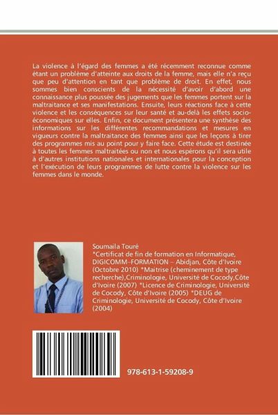 La violence à l'égard des femmes a été récemment reconnue comme étant un problème d'atteinte aux droits de la femme, mais elle n'a reçu que peu d'attention en tant que problème de droit. En effet, nous sommes bien conscients de la nécessité d'avoir d'abord une connaissance plus poussée des jugements que les femmes portent sur la maltraitance et ses manifestations. Ensuite, leurs réactions face à cette violence et les conséquences sur leur santé et au-delà les effets socio-économiques sur elles. Enfin, ce document présentera une synthèse des informations sur les différentes recommandations et mesures en vigueurs contre la maltraitance des femmes ainsi que les leçons à tirer des programmes mis au point pour y faire face. Cette étude est destinée à toutes les femmes maltraitées ou non et nous espérons qu'il sera utile à d'autres institutions nationales et internationales pour la conception et l'exécution de leurs programmes de lutte contre la violence sur les femmes dans le monde.