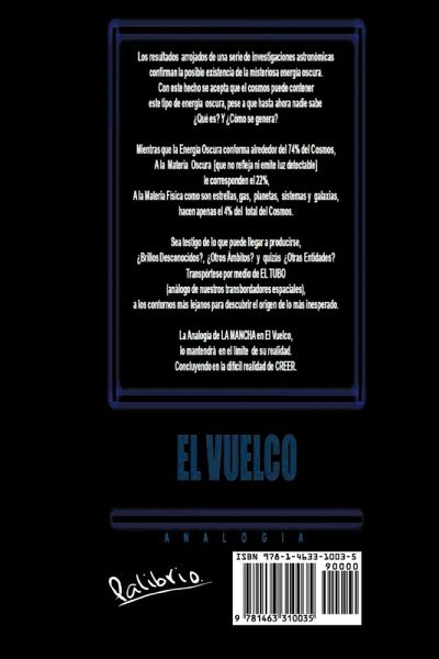 Los resultados arrojados de una serie de investigaciones astronómicas confirman la posible existencia de la misteriosa energía oscura. Con este hecho se acepta que el cosmos puede contenereste tipo de energía oscura, pese a que hasta ahora nadie sabe ¿Qué es? Y ¿Cómo se genera? Mientras que la Energía Oscura conforma alrededor del 74% del Cosmos, A la Materia Oscura [que no refleja ni emite luz detectable] le corresponden el 22%,A la Materia Física como son estrellas, gas, planetas, sistemas y galaxias, hacen apenas el 4% del total del Cosmos. Sea testigo de lo que puede llegar a producirse,¿Brillos Desconocidos?, ¿Otros Ámbitos? y quizás ¿Otras Entidades?Transpórtese por medio de EL TUBO(análogo de nuestros transbordadores espaciales), a los contornos más lejanos para descubrir el origen de lo más inesperado. La Analogía de LA MANCHA en El Vuelco, lo mantendrá en el límite de su realidad.Concluyendo en la difícil realidad de CREER.