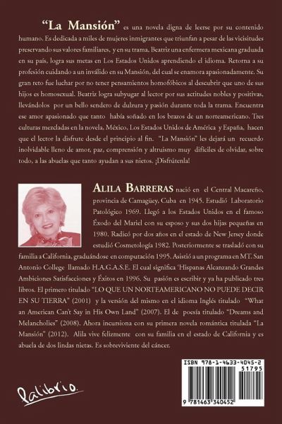"La Mansión" es una novela digna de leerse por su contenido humano. Es dedicada a miles de mujeres inmigrantes que triunfan a pesar de las vicisitudes preservando sus valores familiares, y en su trama, Beatriz una enfermera mexicana graduada en su país, logra sus metas en Los Estados Unidos aprendiendo el idioma. Retorna a su a su profesión cuidando a un inválido en su Mansión, del cual se enamora apasionadamente. Su gran reto fue luchar por no tener pensamientos homofóbicos al descubrir que uno de sus hijos es homosexual. Beatriz logra subyugar al lector por sus actitudes nobles y positivas, llevándolos por un bello sendero de dulzura y pasión durante toda la trama. Encuentra ese amor apasionado que tanto había soñado en los brazos de un norteamericano. Tres culturas mezcladas en la novela, México, Los Estados Unidos de América y España, hacen que el lector la disfrute desde el principio al fi n. "La Mansión" les dejará un recuerdo inolvidable lleno de amor, paz, comprensión y altruismo muy difíciles de olvidar, sobre todo, a las abuelas que tanto ayudan a sus nietos. ¡Disfrútenla!