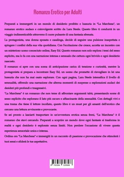 Preparati a immergerti in un mondo di desiderio proibito e lussuria in "La Marchesa", un romanzo erotico audace e coinvolgente scritto da Lara Steele. Questo libro ti condurrà in un viaggio indimenticabile attraverso il cuore pulsante di una fantasia sfrenata.La protagonista, una donna sposata e casalinga, decide di seguire una pulsione inaspettata e spingere i confini della sua vita quotidiana. Con l'eccitazione che cresce, accetta un incontro con un misterioso uomo conosciuto online, Easy Ed. Questo romanzo non solo esplora i temi del sesso esplicito, ma lo fa con una narrazione intensa e sensuale che cattura ogni brivido e ogni desiderio nascosto.Il romanzo si apre con una scena di anticipazione carica di tensione e curiosità, mentre la protagonista si prepara a incontrare Easy Ed, un uomo che promette di risvegliare in lei una lussuria che non ha mai osato esplorare. Con ogni pagina, Lara Steele intensifica il livello di sensualità, offrendo una narrazione che alterna momentidi suspense a esplorazioni audaci dei desideri più profondi e trasgressivi."La Marchesa" è un romanzo che non teme di affrontare argomenti tabù, presentando scene di sesso esplicito che esplorano il lato più oscuro e affascinante della sessualità. Con dettagli vivi e una trama che tiene il lettore incollato, questo libro è un must per gli amanti dell'erotico che cercano una lettura avvincente e provocante.Se sei pronto a lasciarti trasportare in un'avventura erotica senza freni, "La Marchesa" è il romanzo che stavi cercando. Preparati a scoprire un mondo dove ogni fantasie si trasforma in realtà e ogni desiderio è esplorato senza limiti. Non perdere l'occasione di vivere questa esperienza sensoriale unica e intensa.Ordina ora "La Marchesa" e immergiti in un racconto di passione e provocazione che stimolerà i tuoi sensi e sfiderà le tue aspettative.