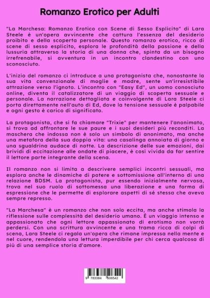 "La Marchesa: Romanzo Erotico con Scene di Sesso Esplicito" di Lara Steele è un'opera avvincente che cattura l'essenza del desiderio proibito e della scoperta personale. Questo romanzo erotico, ricco di scene di sesso esplicito, esplora le profondità della passione e della lussuria attraverso la storia di una donna che, spinta da un bisogno irrefrenabile, si avventura in un incontro clandestino con uno sconosciuto.L'inizio del romanzo ci introduce a una protagonista che, nonostante la sua vita convenzionale di moglie e madre, sente un'irresistibile attrazione verso l'ignoto. L'incontro con "Easy Ed", un uomo conosciuto online, diventa il catalizzatore di un viaggio di scoperta sessuale e personale. La narrazione dettagliata e coinvolgente di Lara Steele ci porta direttamente nell'auto di Ed, dove la tensione sessuale è palpabile e ogni gesto è carico di significato.La protagonista, che si fa chiamare "Trixie" per mantenere l'anonimato, si trova ad affrontare le sue paure e i suoidesideri più reconditi. La maschera che indossa non è solo un simbolo di anonimato, ma anche una metafora della sua doppia vita: una casalinga annoiata di giorno e una sgualdrina audace di notte. La descrizione delle sue emozioni, dai brividi di eccitazione alle ondate di piacere, è così vivida da far sentire il lettore parte integrante della scena.Il romanzo non si limita a descrivere semplici incontri sessuali, ma esplora anche le dinamiche di potere e sottomissione all'interno di una relazione BDSM. La protagonista, pur essendo inizialmente nervosa, trova nel suo ruolo di sottomessa una liberazione e una forma di espressione che le permette di esplorare aspetti di sé stessa che aveva sempre represso."La Marchesa" è un romanzo che non solo eccita, ma anche stimola la riflessione sulle complessità del desiderio umano. È un viaggio intenso e appassionato che ogni lettore appassionato di erotismo non vorrà perdersi. Con una scrittura avvincente e una trama ricca di colpi di scena,Lara Steele ci regala un'opera che rimane impressa nella mente e nel cuore, rendendola una lettura imperdibile per chi cerca qualcosa di più di una semplice storia d'amore.
