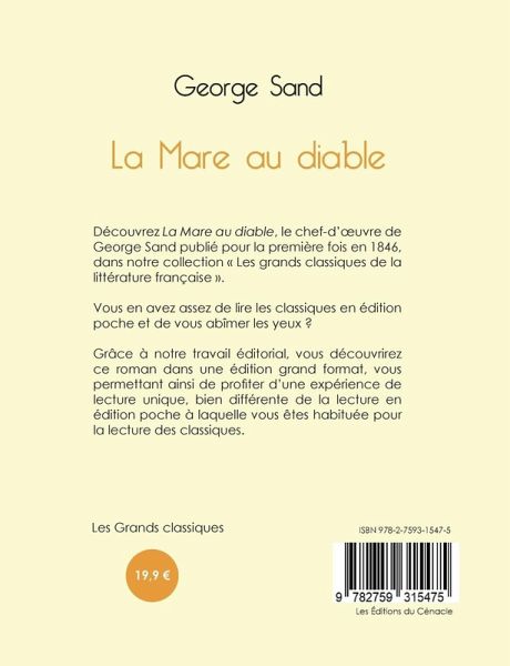 Découvrez La Mare au diable, le chef-d¿¿uvre de George Sand publié pour la première fois en 1846, dans notre collection « Les grands classiques de la littérature française ». Vous en avez assez de lire les classiques en édition poche et de vous abîmer les yeux ? Grâce à notre travail éditorial, vous découvrirez ce roman dans une édition grand format, vous permettant ainsi de profiter d¿une expérience de lecture unique, bien différente de la lecture en édition poche à laquelle vous êtes habituée pour la lecture des classiques.