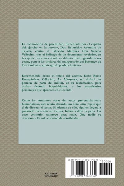 La reclamación de paternidad, presentada por el capitán del ejército en la reserva, Don Estanislao Azumbre de Tejada, contra el fallecido Marqués Don Sancho Vellocino, tras el hallazgo de un documento revelador, en la caja de calcetines donde su difunta madre guardaba sus cosas, pone a los titulares del marquesado del Barranco de los Cernícalos, en riesgo de perder el mismo. Desentendida del asunto desde el inicio, Doña Rocío Entrepiedras Vellocino, La Marquesa, no dudará en ponerse de parte del militar, en su reclamación, para acabar dejando boquiabiertos, a los estrafalarios personajes que aparecen en el cuento. Como las anteriores obras del autor, pretendidamente humorísticas, este relato absurdo, no tiene otro objeto que el de distraer al lector. Si además de ello, alguien llegara a pasárselo bien con su lectura, habría valido la pena. En caso contrario, tampoco pasa nada. Que nadie se obsesione. Es solo cuestión de sensibilidad.