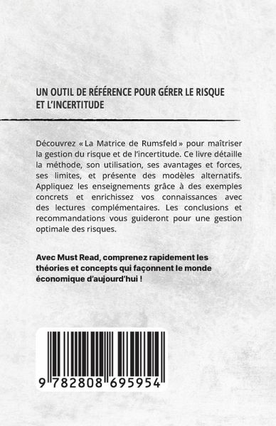 Découvrez "La Matrice de Rumsfeld" pour maîtriser la gestion du risque et de l'incertitude. Ce livre détaille la méthode, son utilisation, ses avantages et forces, ses limites, et présente des modèles alternatifs. Appliquez les enseignements grâce à des exemples concrets et enrichissez vos connaissances avec des lectures complémentaires. Les conclusions et recommandations vous guideront pour une gestion optimale des risques.