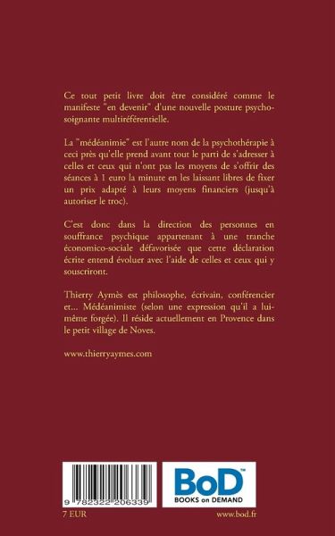La "médéanimie" est l'autre nom de la psychothérapie à ceci près qu'elle prend avant toute le parti de s'adresser à celles et ceux qui n'ont pas les moyens de s'offrir des séances à 1 euro la minute en laissant les patients libres de fixer un prix adapté à leurs moyens financiers jusqu'à autoriser le troc.