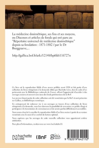 La médecine dosimétrique, ses fins et ses moyens, ou Discours et articles de fonds qui ont paru au "Répertoire universel de médecine dosimétrique" depuis sa fondation: 1871-1882 / par le Dr Burggraeve, ... Date de l'édition originale: 1883 Sujet de l'ouvrage: Dosimétrie Le présent ouvrage s'inscrit dans une politique de conservation patrimoniale des ouvrages de la littérature Française mise en place avec la BNF. HACHETTE LIVRE et la BNF proposent ainsi un catalogue de titres indisponibles, la BNF ayant numérisé ces oeuvres et HACHETTE LIVRE les imprimant à la demande. Certains de ces ouvrages reflètent des courants de pensée caractéristiques de leur époque, mais qui seraient aujourd'hui jugés condamnables. Ils n'en appartiennent pas moins à l'histoire des idées en France et sont susceptibles de présenter un intérêt scientifique ou historique. Le sens de notre démarche éditoriale consiste ainsi à permettre l'accès à ces oeuvres sans pour autant que nous en cautionnions en aucune façon le contenu. Pour plus d'informations, rendez-vous sur www.hachettebnf.fr