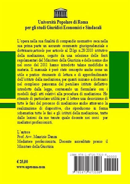 L'opera reca nella sua prima parte un accurato commento giurisprudenziale e dottrinario,articolo per articolo al D.lgs n.28/2010 istitutivo della mediazione, seguito da una selezione delle fonti regolamentari del Ministero della Giustizia e delle norme che nel corso del 2011 hanno introdotto talune modifiche in materia,tra cui la recentissima circolare 20 del dicembre 2011. Pratico strumento di lettura e di approfondimento dell'istituto della mediazione, per quanti iniziano a districarsi nel complesso panorama del peculiare istituto deflattivo introdotto dalla legge, contenendo un formulario con i modelli degli atti relativi alla procedura di mediazione. Presenta una descrizione di tutte le fasi del processo di mediazione anche attraverso la realizzazione di diapositive, che riproducono in forma schematica tutte le fasi e gli istituti della mediazione, tratte dalle lezioni dell'Avv.Danza tenute quale docente nei corsi per mediatori professionisti.