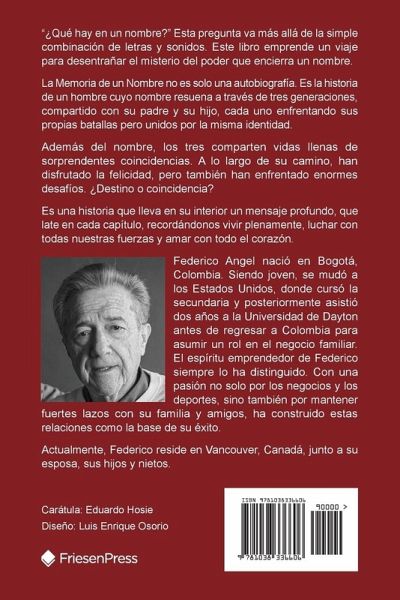 "¿Qué hay en un nombre?" Esta pregunta va más allá de la simple combinación de letras y sonidos. Este libro emprende un viaje para desentrañar el misterio del poder que encierra un nombre. La Memoria de un Nombre no es solo una autobiografía. Es la historia de un hombre cuyo nombre resuena a través de tres generaciones, compartido con su padre y su hijo, cada uno enfrentando sus propias batallas pero unidos por la misma identidad. Además del nombre, los tres comparten vidas llenas de sorprendentes coincidencias. A lo largo de su camino, han disfrutado la felicidad, pero también han enfrentado enormes desafíos. ¿Destino o coincidencia? Es una historia que lleva en su interior un mensaje profundo, que late en cada capítulo, recordándonos vivir plenamente, luchar con todas nuestras fuerzas y amar con todo el corazón.