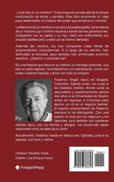 "¿Qué hay en un nombre?" Esta pregunta va más allá de la simple combinación de letras y sonidos. Este libro emprende un viaje para desentrañar el misterio del poder que encierra un nombre. La Memoria de un Nombre no es solo una autobiografía. Es la historia de un hombre cuyo nombre resuena a través de tres generaciones, compartido con su padre y su hijo, cada uno enfrentando sus propias batallas pero unidos por la misma identidad. Además del nombre, los tres comparten vidas llenas de sorprendentes coincidencias. A lo largo de su camino, han disfrutado la felicidad, pero también han enfrentado enormes desafíos. ¿Destino o coincidencia? Es una historia que lleva en su interior un mensaje profundo, que late en cada capítulo, recordándonos vivir plenamente, luchar con todas nuestras fuerzas y amar con todo el corazón.