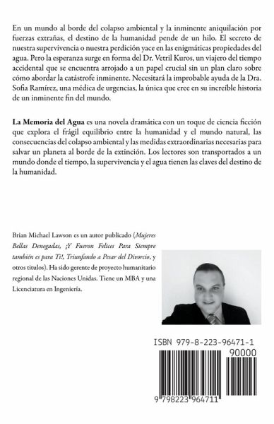 En un mundo al borde del colapso ambiental y la inminente aniquilación por fuerzas extrañas, el destino de la humanidad pende de un hilo. El secreto de nuestra supervivencia o nuestra perdición yace en las enigmáticas propiedades del agua. Pero la esperanza surge en forma del Dr. Vetril Kuros, un viajero del tiempo accidental que se encuentra arrojado a un papel crucial sin un plan claro sobre cómo abordar la catástrofe inminente. Necesitará la improbable ayuda de la Dra. Sofia Ramírez, una médica de urgencias, la única que cree en su increíble historia de un inminente fin del mundo. La Memoria del Agua es una novela dramática fascinante con un toque de ciencia ficción que explora el frágil equilibrio entre la humanidad y el mundo natural, las consecuencias del colapso ambiental y las medidas extraordinarias necesarias para salvar un planeta al borde de la extinción. A través de los ojos del Dr. Vetril Kuros, los lectores son transportados a un mundo donde el tiempo, la supervivencia y el agua tienen las claves del destino último de la humanidad.