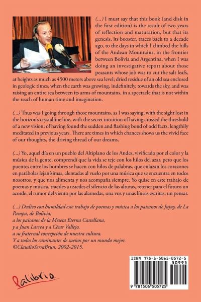 (...) I must say that this book (and disk in the first edition) is the result of two years of reflection and maturation, but that its genesis, its booster, traces back to a decade ago, to the days in which I climbed the hills of the Andean Mountains, in the frontier between Bolivia and Argentina, when I was doing an investigative report about those peasants whose job was to cut the salt leafs, at heights as much as 4500 meters above sea level; dried residue of an old sea enclosed in geologic times, when the earth was growing, indefinitely, towards the sky, and was raising an entire sea between its arms of mountains, in a spectacle that is not within the reach of human time and imagination. (...) Thus was I going through those mountains, as I was saying, with the sight lost in the horizon's crystalline line, with the secret intuition of having crossed the threshold of a new vision; of having found the sudden and flashing bond of odd facts, lengthily meditated in previous years. There are times in which chances shows us the vivid face of our thoughts, the driving thread of our dreams. (...) Yo, aquel día en un pueblo del Altiplano de los Andes, vivificado por el color y la música de la gente, comprendí que la vida se teje con los hilos del azar, pero que los puentes entre los hombres se hacen con hilos de palabras, que enlazan los corazones en parábolas lejanísimas, alentadas al vuelo por una música que se encuentra en todos nosotros, y que nos alimenta y nos acompaña siempre. Yo quise en este trabajo de poemas y música, traerles a ustedes el silencio de las alturas, retener para el futuro un acorde, el rumor del viento por las alamedas, una voz y unas líneas escritas, un pensar. (...) Dedico con humildad este trabajo de poemas y música a los paisanos de Jujuy, de La Pampa, de Bolivia, a los paisanos de la Meseta Eterna Castellana, y a Juan Larrea y a César Vallejo, a su fraternal concepción de nuestra cultura. Y a todos los caminantes de sueños por un mundo mejor. ©ClaudioSerraBrun, 2002-2015.