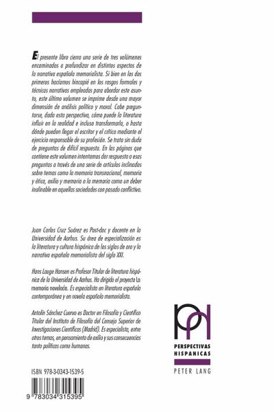 El presente libro cierra una serie de tres volúmenes encaminados a profundizar en distintos aspectos de la narrativa española memorialista. Si bien en los dos primeros hacíamos hincapié en los rasgos formales y técnicas narrativas empleadas para abordar este asunto, este último volumen se imprime desde una mayor dimensión de análisis político y moral. Cabe preguntarse, dada esta perspectiva, cómo puede la literatura influir en la realidad e incluso transformarla, o hasta dónde pueden llegar el escritor y el crítico mediante el ejercicio responsable de su profesión. Se trata sin duda de preguntas de difícil respuesta. En las páginas que contiene este volumen intentamos dar respuesta a esas preguntas a través de una serie de artículos inclinados sobre temas como la memoria transnacional, memoria y ética, exilio y memoria o la memoria como un deber inalinable en aquellas sociedades con pasado conflictivo.