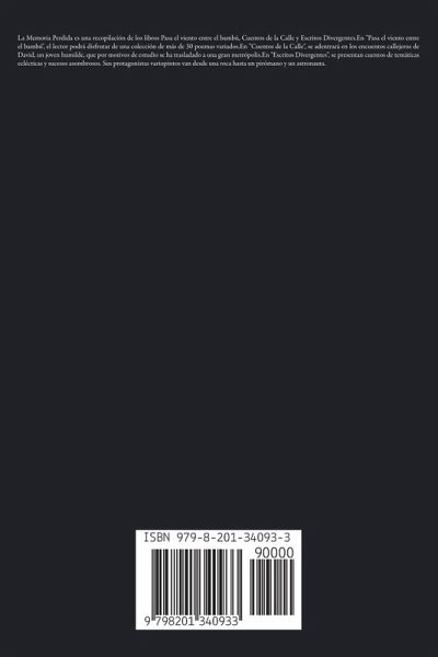 La Memoria Perdida es una recopilación de los libros Pasa el viento entre el bambú, Cuentos de la Calle y Escritos Divergentes.En "Pasa el viento entre el bambú", el lector podrá disfrutar de una colección de más de 30 poemas variados.En "Cuentos de la Calle", se adentrará en los encuentos callejeros de David, un joven humilde, que por motivos de estudio se ha trasladado a una gran metrópolis.En "Escritos Divergentes", se presentan cuentos de temáticas eclécticas y sucesos asombrosos. Sus protagonistas variopintos van desde una roca hasta un pirómano y un astronauta.