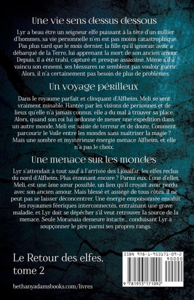 Une vie sens dessus dessous Lyr a beau être un seigneur elfe puissant à la tête d'un millier d'hommes, sa vie personnelle n'en est pas moins catastrophique. Pas plus tard que le mois dernier, la fille qu'il ignorait avoir a débarqué de la Terre, lui apprenant la mort de son ancien amour. Depuis, il a été trahi, capturé et presque assassiné. Même s'il a vaincu son ennemi, ses blessures ne semblent pas vouloir guérir. Alors, il n'a certainement pas besoin de plus de problèmes. Un voyage périlleux Dans le royaume parfait et clinquant d'Alfheim, Meli se sent vraiment minable. Hantée par les visions de personnes et de lieux qu'elle n'a jamais connus, elle a du mal à trouver sa place. Alors, quand son roi lui ordonne de mener une expédition dans un autre monde, Meli est saisie de terreur et de doute. Comment parcourir le Voile entre les mondes sans maîtriser la magie ? Mais une sombre et mystérieuse énergie menace Alfheim, et elle n'a pas le choix. Une menace sur les mondes Lyr s'attendait à tout sauf à l'arrivée des Ljósálfar, les elfes reclus du nord d'Alfheim. Plus étonnant encore ? Parmi eux, l'une d'elles, Meli, est une âme s¿ur possible, un lien qu'il croyait avoir perdu avec son ancien amour. Mais blessé et assiégé de tous côtés, il ne peut pas se laisser déconcentrer. Une énergie empoisonnée envahit les royaumes féeriques interconnectés, entraînant une grave maladie, et Lyr doit se dépêcher s'il veut retrouver la source de la menace. Seule Moranaia demeure intacte... conduisant Lyr à soupçonner le pire parmi ses propres rangs.