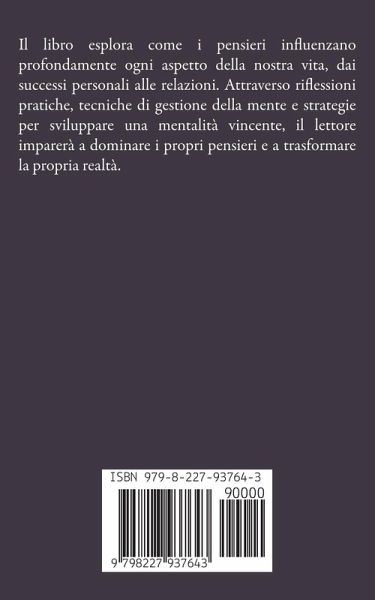 Il libro esplora come i pensieri influenzano profondamente ogni aspetto della nostra vita, dai successi personali alle relazioni. Attraverso riflessioni pratiche, tecniche di gestione della mente e strategie per sviluppare una mentalità vincente, il lettore imparerà a dominare i propri pensieri e a trasformare la propria realtà.
