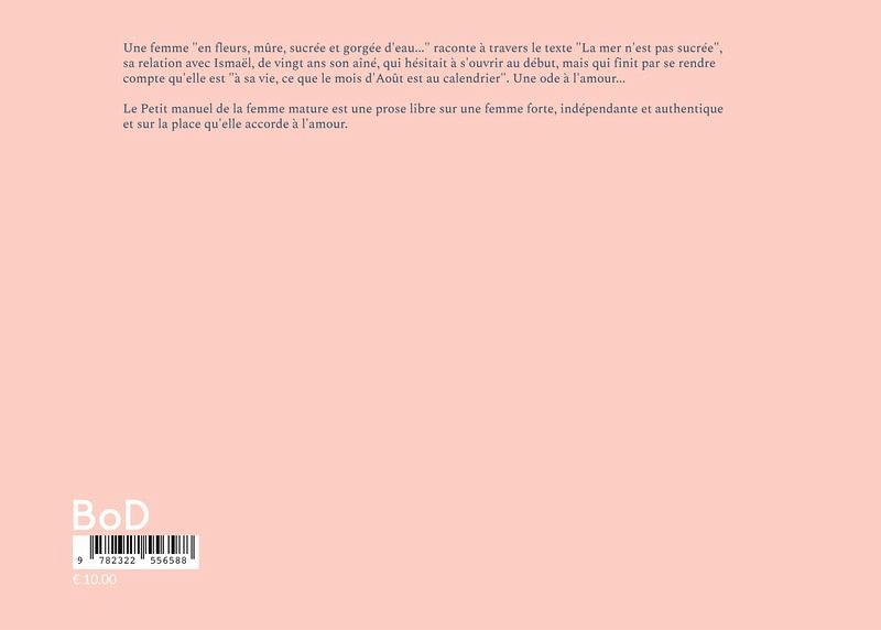Une femme "en fleurs, mûre, sucrée et gorgée d'eau..." raconte à travers le texte "La mer n'est pas sucrée", sa relation avec Ismaël, de vingt ans son aîné, qui hésitait à s'ouvrir au début, mais qui finit par se rendre compte qu'elle est "à sa vie, ce que le mois d'Août est au calendrier". Une ode à l'amour... Le Petit manuel de la femme mature est une prose libre sur une femme forte, indépendante et authentique et sur la place qu'elle accorde à l'amour.
