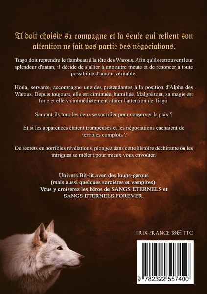 Il doit choisir sa compagne et la seule qui retient son attention ne fait pas partie des négociations. Tiago doit reprendre le flambeau à la tête des Warous. Afin qu'ils retrouvent leur splendeur d'antan, il décide de s'allier à une autre meute et de renoncer à toute possibilité d'amour véritable. Horia, servante, accompagne une des prétendantes à la position d'Alpha des Warous. Depuis toujours, elle est diminuée, humiliée. Malgré tout, sa magie est forte et elle va immédiatement attirer l'attention de Tiago. Sauront-ils tous les deux se sacrifier pour conserver la paix ? Et si les apparences étaient trompeuses et les négociations cachaient de terribles complots ? De secrets en horribles révélations, plongez dans cette histoire déchirante où les intrigues se mêlent pour mieux vous envoûter. Univers Bit-lit avec des loups-garous (mais aussi quelques sorcières et vampires). Vous y croiserez les héros de SANGS ETERNELS et SANGS ETERNELS FOREVER. Un univers comprenant 3 sagas indépendantes. Retrouvez vos personnages préférés dans : - Sangs éternels (5 tomes) - Sangs éternels forever (3 tomes) - La meute des Warous (2 tomes) Laissez-vous emporter !