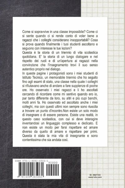 Cos'è oggi la scuola? E' ancora possibile insegnare ai giovani la letteratura? Come si dialoga con i ragazzi? Una insegnante di lettere di scuola media superiore vive tre anni di dialogo con una sua classe molto speciale. Il libro non è un romanzo, ma racconta, in prima persona, una storia vera, senza prediche e senza facili pedanterie. "Non esiste un solo modo di insegnare o di essere persone. Esiste una realtà, in questo caso scolastica, con cui si deve interagire inventandosi un linguaggio complesso e dedicato. E non esiste un modo per farsi rispettare ed amare diverso da quello di amare e rispettare per primi. Questa è stata la mia vita di insegnante e sono contentissima che sia andata così." Maria Serena Peterlin