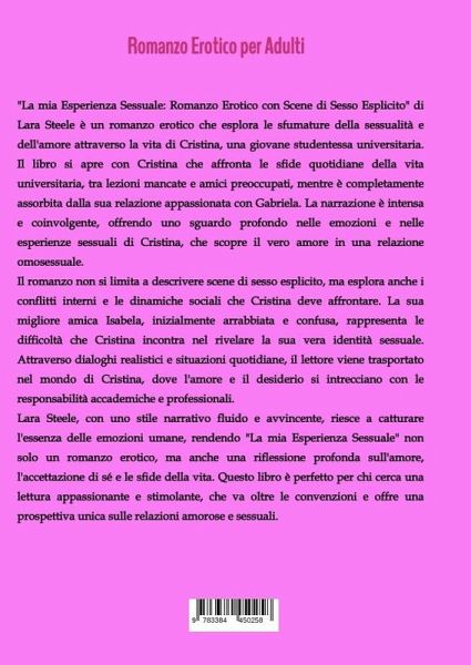 "La mia Esperienza Sessuale: Romanzo Erotico con Scene di Sesso Esplicito" di Lara Steele è un romanzo erotico che esplora le sfumature della sessualità e dell'amore attraverso la vita di Cristina, una giovane studentessa universitaria. Il libro si apre con Cristina che affronta le sfide quotidiane della vita universitaria, tra lezioni mancate e amici preoccupati, mentre è completamente assorbita dalla sua relazione appassionata con Gabriela. La narrazione è intensa e coinvolgente, offrendo uno sguardo profondo nelle emozioni e nelle esperienze sessuali di Cristina, che scopre il vero amore in una relazione omosessuale.Il romanzo non si limita a descrivere scene di sesso esplicito, ma esplora anche i conflitti interni e le dinamiche sociali che Cristina deve affrontare. La sua migliore amica Isabela, inizialmente arrabbiata e confusa, rappresenta le difficoltà che Cristina incontra nel rivelare la sua vera identità sessuale. Attraverso dialoghi realistici e situazioni quotidiane,il lettore viene trasportato nel mondo di Cristina, dove l'amore e il desiderio si intrecciano con le responsabilità accademiche e professionali.Lara Steele, con uno stile narrativo fluido e avvincente, riesce a catturare l'essenza delle emozioni umane, rendendo "La mia Esperienza Sessuale" non solo un romanzo erotico, ma anche una riflessione profonda sull'amore, l'accettazione di sé e le sfide della vita. Questo libro è perfetto per chi cerca una lettura appassionante e stimolante, che va oltre le convenzioni e offre una prospettiva unica sulle relazioni amorose e sessuali.