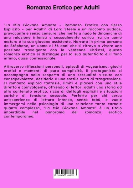 "La Mia Giovane Amante - Romanzo Erotico con Sesso Esplicito - per Adulti" di Lara Steele è un racconto audace, provocante e senza censure, che mette a nudo le dinamiche di una relazione intensa e sessualmente carica tra un uomo maturo e la sua giovane assistente. Narrato in prima persona da Stéphane, un uomo di 36 anni che si ritrova a vivere una passione travolgente con la ventenne Christel, questo romanzo erotico si distingue per la sua autenticità e il tono intimo, quasi confessionale. Attraverso riflessioni personali, episodi di voyeurismo, giochi erotici e momenti di pura complicità, il protagonista ci accompagna nella scoperta di una sessualità vissuta con consapevolezza, desiderio e una sottile vena di trasgressione. Il romanzo esplora fantasie, limiti e piaceri con uno stile diretto e coinvolgente, offrendo ai lettori adulti una storia ad alto contenuto erotico, ricca di dettagli espliciti e situazioni cariche di tensione sessuale. Perfetto per chi cerca un'esperienza dilettura intensa, senza tabù, e vuole immergersi nella psicologia di una relazione tanto carnale quanto complessa, "La Mia Giovane Amante" è un titolo imperdibile nel panorama del romanzo erotico contemporaneo.
