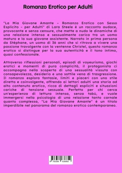 "La Mia Giovane Amante - Romanzo Erotico con Sesso Esplicito - per Adulti" di Lara Steele è un racconto audace, provocante e senza censure, che mette a nudo le dinamiche di una relazione intensa e sessualmente carica tra un uomo maturo e la sua giovane assistente. Narrato in prima persona da Stéphane, un uomo di 36 anni che si ritrova a vivere una passione travolgente con la ventenne Christel, questo romanzo erotico si distingue per la sua autenticità e il tono intimo, quasi confessionale. Attraverso riflessioni personali, episodi di voyeurismo, giochi erotici e momenti di pura complicità, il protagonista ci accompagna nella scoperta di una sessualità vissuta con consapevolezza, desiderio e una sottile vena di trasgressione. Il romanzo esplora fantasie, limiti e piaceri con uno stile diretto e coinvolgente, offrendo ai lettori adulti una storia ad alto contenuto erotico, ricca di dettagli espliciti e situazioni cariche di tensione sessuale. Perfetto per chi cerca un'esperienza dilettura intensa, senza tabù, e vuole immergersi nella psicologia di una relazione tanto carnale quanto complessa, "La Mia Giovane Amante" è un titolo imperdibile nel panorama del romanzo erotico contemporaneo.