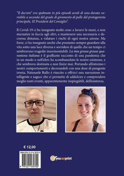 "Il decreto" era spalmato in più episodi serali di una durata variabile a seconda del grado di giramento di palle del protagonista principale, El President del Consiglio. Il Covid-19 ci ha insegnato molte cose: a lavarci le mani, a non starnutire in faccia agli altri, a mantenere una necessaria e decorosa distanza a valutare i rischi di ogni nostra azione. Ma forse, ci ha insegnato anche che possiamo sempre guardare alla vita sotto una luce diversa e sorridere di quelle che un tempo sembravano tragedie insormontabili. La mia grossa grassa quarantena italiana è il graffiante racconto di una pandemia che in un modo o nell'altro ha scombussolato le nostre esistenze, e che sembrava destinata a non finire mai. Portando all'estremo i nostri comportamenti e decorandoli con una dose di pungente ironia, Natanaele Rullo è riuscito a offrirci una narrazione intelligente e sagace che ci permette di addolcire e comprendere meglio tanti eventi, apparentemente inspiegabili, dell'esistenza.