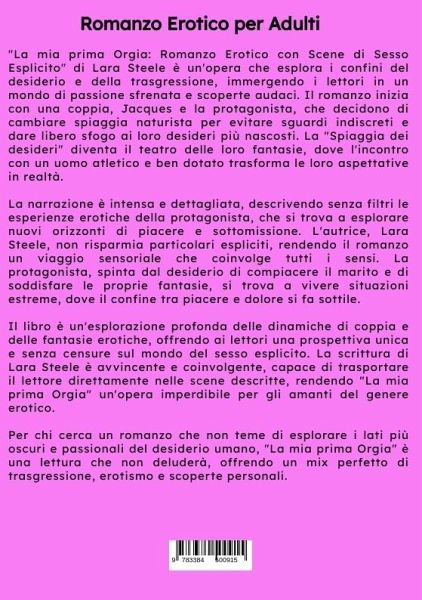 "La mia prima Orgia: Romanzo Erotico con Scene di Sesso Esplicito" di Lara Steele è un'opera che esplora i confini del desiderio e della trasgressione, immergendo i lettori in un mondo di passione sfrenata e scoperte audaci. Il romanzo inizia con una coppia, Jacques e la protagonista, che decidono di cambiare spiaggia naturista per evitare sguardi indiscreti e dare libero sfogo ai loro desideri più nascosti. La "Spiaggia dei desideri" diventa il teatro delle loro fantasie, dove l'incontro con un uomo atletico e ben dotato trasforma le loro aspettative in realtà.La narrazione è intensa e dettagliata, descrivendo senza filtri le esperienze erotiche della protagonista, che si trova a esplorare nuovi orizzonti di piacere e sottomissione. L'autrice, Lara Steele, non risparmia particolari espliciti, rendendo il romanzo un viaggio sensoriale che coinvolge tutti i sensi. La protagonista, spinta dal desiderio di compiacere il marito e di soddisfare le proprie fantasie, si trova a vivere situazioni estreme, dove il confine tra piacere e dolore si fa sottile.Il libro è un'esplorazione profonda delle dinamiche di coppia e delle fantasie erotiche, offrendo ai lettori una prospettiva unica e senza censure sul mondo del sesso esplicito. La scrittura di Lara Steele è avvincente e coinvolgente, capace di trasportare il lettore direttamente nelle scene descritte, rendendo "La mia prima Orgia" un'opera imperdibile per gli amanti del genere erotico.Per chi cerca un romanzo che non teme di esplorare i lati più oscuri e passionali del desiderio umano, "La mia prima Orgia" è una lettura che non deluderà, offrendo un mix perfetto di trasgressione, erotismo e scoperte personali.