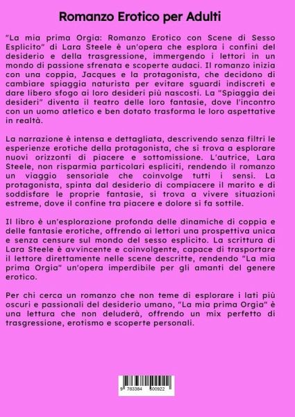 "La mia prima Orgia: Romanzo Erotico con Scene di Sesso Esplicito" di Lara Steele è un'opera che esplora i confini del desiderio e della trasgressione, immergendo i lettori in un mondo di passione sfrenata e scoperte audaci. Il romanzo inizia con una coppia, Jacques e la protagonista, che decidono di cambiare spiaggia naturista per evitare sguardi indiscreti e dare libero sfogo ai loro desideri più nascosti. La "Spiaggia dei desideri" diventa il teatro delle loro fantasie, dove l'incontro con un uomo atletico e ben dotato trasforma le loro aspettative in realtà.La narrazione è intensa e dettagliata, descrivendo senza filtri le esperienze erotiche della protagonista, che si trova a esplorare nuovi orizzonti di piacere e sottomissione. L'autrice, Lara Steele, non risparmia particolari espliciti, rendendo il romanzo un viaggio sensoriale che coinvolge tutti i sensi. La protagonista, spinta dal desiderio di compiacere il marito e di soddisfare le proprie fantasie, si trova a vivere situazioni estreme, dove il confine tra piacere e dolore si fa sottile.Il libro è un'esplorazione profonda delle dinamiche di coppia e delle fantasie erotiche, offrendo ai lettori una prospettiva unica e senza censure sul mondo del sesso esplicito. La scrittura di Lara Steele è avvincente e coinvolgente, capace di trasportare il lettore direttamente nelle scene descritte, rendendo "La mia prima Orgia" un'opera imperdibile per gli amanti del genere erotico.Per chi cerca un romanzo che non teme di esplorare i lati più oscuri e passionali del desiderio umano, "La mia prima Orgia" è una lettura che non deluderà, offrendo un mix perfetto di trasgressione, erotismo e scoperte personali.