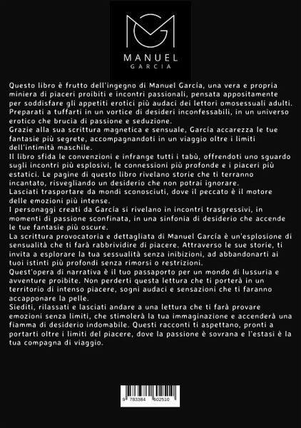 Questo libro nasce da un'idea di Manuel García, una vera e propria miniera di piaceri proibiti e incontri passionali, pensata appositamente per soddisfare gli appetiti erotici più audaci dei lettori adulti omosessuali.Preparatevi a tuffarvi in un vortice di desideri inconfessabili, in un universo erotico che brucia di passione e seduzione. Grazie alla sua scrittura magnetica e sensuale, García accarezza le vostre fantasie più segrete, accompagnandovi in un viaggio oltre i limiti dell'intimità maschile.Il libro sfida le convenzioni e infrange tutti i tabù, offrendo uno sguardo agli incontri più esplosivi, ai legami più profondi e ai piaceri più estatici. Le pagine di questo libro rivelano storie che vi terranno incantati, risvegliando un desiderio che non potrete ignorare.Lasciatevi trasportare da mondi sconosciuti, dove il peccato è il motore delle emozioni più intense. I personaggi creati da García si rivelano in incontri trasgressivi, in momenti di passione sconfinata, in una sinfonia di desiderio che accende le vostre fantasie più oscure.La scrittura provocatoria e dettagliata di Manuel García è un'esplosione di sensualità che vi farà rabbrividire di piacere. Attraverso le sue storie, vi invita a esplorare la vostra sessualità senza inibizioni, ad abbandonarvi ai vostri istinti più profondi senza rimorsi o restrizioni.Quest'opera di narrativa è il vostro passaporto per un mondo di lussuria e avventure proibite. Non perdetevi questa lettura che vi porterà in un territorio di piacere intenso, sogni audaci e sensazioni che vi faranno accapponare la pelle.Sedetevi, rilassatevi e lasciatevi andare a una lettura che vi farà provare emozioni senza limiti, che stimolerà la vostra immaginazione e accenderà una fiamma di desiderio indomabile. Questi racconti vi aspettano, pronti a portarvi oltre i limiti del piacere, dove la passione è sovrana e l'estasi è la vostra compagna di viaggio.