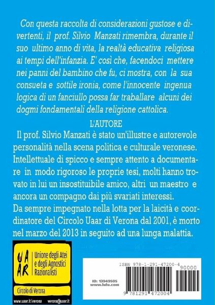 Memorie infantili, gustose e divertenti, di un rampollo di "buona famiglia" allevato in ambiente devotamente conformato alla religione ambientale. Gli insegnamenti teologali ammanniti dagli "operatori di mestiere" sono visti con l'ottica di un fanciullo curioso, capiti e giudicati con la spontanea e ingenua naturalezza proporzionata alla verde età, già venata peraltro dai primi sintomi di spirito critico.