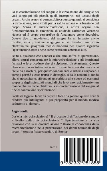 La microcircolazione del sangue è la circolazione del sangue nei vasi sanguigni più piccoli, quelli incorporati nei tessuti degli organi. Anche se non si pensa subito a questo quando si considera la circolazione, sono vitali per la salute umana e la funzione del corpo. Senza la microcircolazione, i nostri organi non funzionerebbero, la rimozione di anidride carbonica verrebbe ridotta ed il corpo cesserebbe di funzionare come dovrebbe. Questo tipo di movimento del sangue ha un impatto, anche diretto, sulla pressione sanguigna ed è diventato un primo obiettivo nei progressi medici moderni per quanto riguarda l'ipertensione, nota anche come pressione arteriosa alta. Se tu o qualcuno che conosci o che ami, soffre di ipertensione, allora potrai comprendere la microcircolazione e gli imminenti farmaci e le procedure che ti colpiscono direttamente. Questo libro è un corso intensivo scientificamente accurato, ma anche facile da assorbire, per questo fondamentale sistema corporeo. I come, i perché e cosa tratta in dettaglio, ti da le nozioni di fondo che ti necessitano, offrendoti un'occhiata alle nuove ed eccitanti scoperte degli scienziati mondiali che lavorano rapidamente - un mondo che ha come obiettivo la microcircolazione del sangue al fine di controllare l'ipertensione. Facile da leggere, facile da capire e facile da godere, questo libro ti renderà più intelligente e più preparato per il mondo medico seducente di domani. Argomenti: Cos'è la microcircolazione? * Il processo di diffusione del sangue a livello della microcircolazione * l'ipertensione e la sua relazione con la microcircolazione * Usare la conoscenza della microcircolazione nella prevenzione dei danni terminali degli organi * terapia fisica vascolare di Bemer