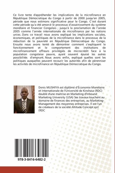 Ce livre tente d'appréhender les implications de la microfinance en République Démocratique du Congo à partir de 2000 jusqu'en 2005, période que nous estimons significative pour le Congo. C'est durant cette période qu'a été amorcé le processus d'assainissement du système monétaire et financier Congolais ; jusqu'à la proclamation de l'année 2005 comme l'année internationale de microfinance par les nations unies. Dans ce travail nous avons expliqué les implications sociales, économiques, et politiques de la microfinance dans le processus de la réduction de la pauvreté en République Démocratique du Congo. Ensuite nous avons tenté de démontrer comment s'expliquent le fonctionnement et le comportement des institutions de microfinancement offreurs privilégiés de microcrédit face à la population congolaise pauvre, ayant souvent épuisé les autres possibilités d'emprunt. Nous avons enfin, expliqué quelles sont les politiques auxquelles peuvent recourir les autorités afin de pérenniser les activités de microfinance en République Démocratique du Congo.