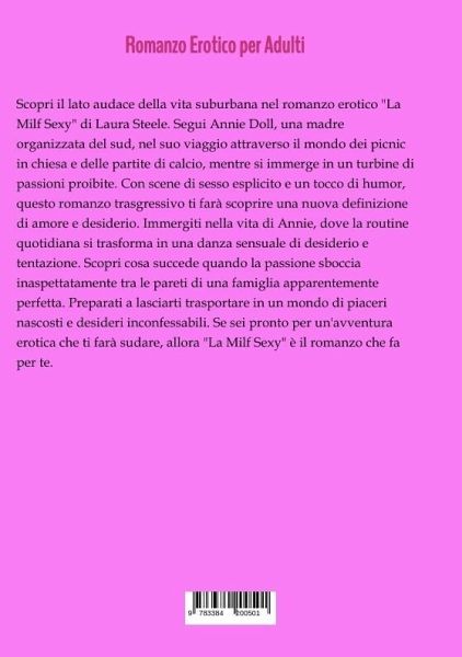 Scopri il lato audace della vita suburbana nel romanzo erotico "La Milf Sexy" di Laura Steele. Segui Annie Doll, una madre organizzata del sud, nel suo viaggio attraverso il mondo dei picnic in chiesa e delle partite di calcio, mentre si immerge in un turbine di passioni proibite. Con scene di sesso esplicito e un tocco di humor, questo romanzo trasgressivo ti farà scoprire una nuova definizione di amore e desiderio. Immergiti nella vita di Annie, dove la routine quotidiana si trasforma in una danza sensuale di desiderio e tentazione. Scopri cosa succede quando la passione sboccia inaspettatamente tra le pareti di una famiglia apparentemente perfetta. Preparati a lasciarti trasportare in un mondo di piaceri nascosti e desideri inconfessabili. Se sei pronto per un'avventura erotica che ti farà sudare, allora "La Milf Sexy" è il romanzo che fa per te.