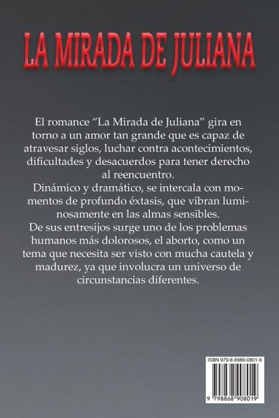 El romance "La Mirada de Juliana" gira en torno a un amor tan grande que es capaz de atravesar siglos, luchar contra acontecimientos, dificultades y desacuerdos para tener derecho al reencuentro. Dinámico y dramático, se intercala con momentos de profundo éxtasis, que vibran luminosamente en las almas sensibles. De sus entresijos surge uno de los problemas humanos más dolorosos, el aborto, como un tema que necesita ser visto con mucha cautela y madurez, ya que involucra un universo de circunstancias diferentes.