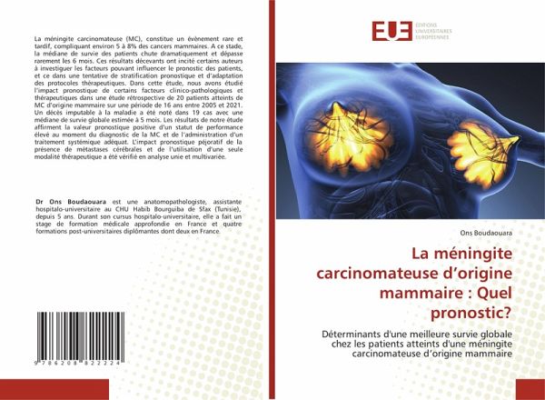 La méningite carcinomateuse (MC), constitue un évènement rare et tardif, compliquant environ 5 à 8% des cancers mammaires. A ce stade, la médiane de survie des patients chute dramatiquement et dépasse rarement les 6 mois. Ces résultats décevants ont incité certains auteurs à investiguer les facteurs pouvant influencer le pronostic des patients, et ce dans une tentative de stratification pronostique et d'adaptation des protocoles thérapeutiques. Dans cette étude, nous avons étudié l'impact pronostique de certains facteurs clinico-pathologiques et thérapeutiques dans une étude rétrospective de 20 patients atteints de MC d'origine mammaire sur une période de 16 ans entre 2005 et 2021. Un décès imputable à la maladie a été noté dans 19 cas avec une médiane de survie globale estimée à 5 mois. Les résultats de notre étude affirment la valeur pronostique positive d'un statut de performance élevé au moment du diagnostic de la MC et de l'administration d'un traitement systémique adéquat. L'impact pronostique péjoratif de la présence de métastases cérébrales et de l'utilisation d'une seule modalité thérapeutique a été vérifié en analyse unie et multivariée.