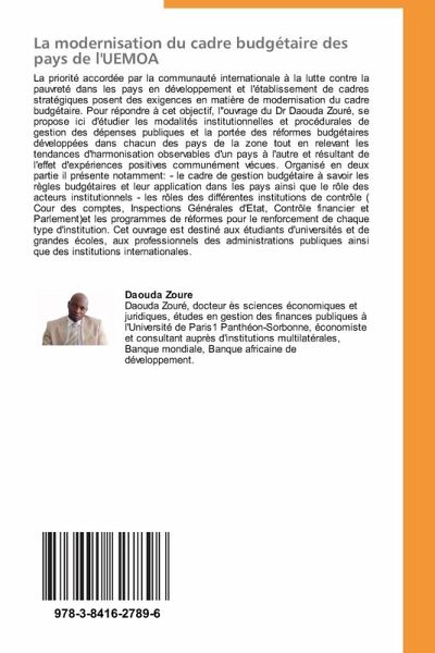 La priorité accordée par la communauté internationale à la lutte contre la pauvreté dans les pays en développement et l'établissement de cadres stratégiques posent des exigences en matière de modernisation du cadre budgétaire. Pour répondre à cet objectif, l''ouvrage du Dr Daouda Zouré, se propose ici d'étudier les modalités institutionnelles et procédurales de gestion des dépenses publiques et la portée des réformes budgétaires développées dans chacun des pays de la zone tout en relevant les tendances d'harmonisation observables d'un pays à l'autre et résultant de l'effet d'expériences positives communément vécues. Organisé en deux partie il présente notamment: - le cadre de gestion budgétaire à savoir les règles budgétaires et leur application dans les pays ainsi que le rôle des acteurs institutionnels - les rôles des différentes institutions de contrôle ( Cour des comptes, Inspections Générales d'Etat, Contrôle financier et Parlement)et les programmes de réformes pour le renforcement de chaque type d'institution. Cet ouvrage est destiné aux étudiants d'universités et de grandes écoles, aux professionnels des administrations publiques ainsi que des institutions internationales.
