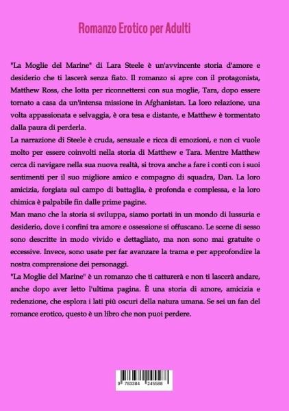 "La Moglie del Marine" di Lara Steele è un'avvincente storia d'amore e desiderio che ti lascerà senza fiato. Il romanzo si apre con il protagonista, Matthew Ross, che lotta per riconnettersi con sua moglie, Tara, dopo essere tornato a casa da un'intensa missione in Afghanistan. La loro relazione, una volta appassionata e selvaggia, è ora tesa e distante, e Matthew è tormentato dalla paura di perderla.La narrazione di Steele è cruda, sensuale e ricca di emozioni, e non ci vuole molto per essere coinvolti nella storia di Matthew e Tara. Mentre Matthew cerca di navigare nella sua nuova realtà, si trova anche a fare i conti con i suoi sentimenti per il suo migliore amico e compagno di squadra, Dan. La loro amicizia, forgiata sul campo di battaglia, è profonda e complessa, e la loro chimica è palpabile fin dalle prime pagine.Man mano che la storia si sviluppa, siamo portati in un mondo di lussuria e desiderio, dove i confini tra amore e ossessione si offuscano. Le scene di sesso sono descritte in modo vivido e dettagliato, ma non sono mai gratuite o eccessive. Invece, sono usate per far avanzare la trama e per approfondire la nostra comprensione dei personaggi."La Moglie del Marine" è un romanzo che ti catturerà e non ti lascerà andare, anche dopo aver letto l'ultima pagina. È una storia di amore, amicizia e redenzione, che esplora i lati più oscuri della natura umana. Se sei un fan del romance erotico, questo è un libro che non puoi perdere.