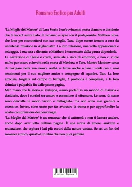 "La Moglie del Marine" di Lara Steele è un'avvincente storia d'amore e desiderio che ti lascerà senza fiato. Il romanzo si apre con il protagonista, Matthew Ross, che lotta per riconnettersi con sua moglie, Tara, dopo essere tornato a casa da un'intensa missione in Afghanistan. La loro relazione, una volta appassionata e selvaggia, è ora tesa e distante, e Matthew è tormentato dalla paura di perderla.La narrazione di Steele è cruda, sensuale e ricca di emozioni, e non ci vuole molto per essere coinvolti nella storia di Matthew e Tara. Mentre Matthew cerca di navigare nella sua nuova realtà, si trova anche a fare i conti con i suoi sentimenti per il suo migliore amico e compagno di squadra, Dan. La loro amicizia, forgiata sul campo di battaglia, è profonda e complessa, e la loro chimica è palpabile fin dalle prime pagine.Man mano che la storia si sviluppa, siamo portati in un mondo di lussuria e desiderio, dove i confini tra amore e ossessione si offuscano. Le scene di sesso sono descritte in modo vivido e dettagliato, ma non sono mai gratuite o eccessive. Invece, sono usate per far avanzare la trama e per approfondire la nostra comprensione dei personaggi."La Moglie del Marine" è un romanzo che ti catturerà e non ti lascerà andare, anche dopo aver letto l'ultima pagina. È una storia di amore, amicizia e redenzione, che esplora i lati più oscuri della natura umana. Se sei un fan del romance erotico, questo è un libro che non puoi perdere.