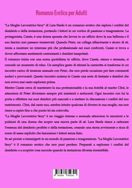 "La Moglie Lavoratrice Sexy" di Lara Steele è un romanzo erotico che esplora i confini del desiderio e della tentazione, portando i lettori in un vortice di passione e trasgressione. La protagonista, Cassie, è una donna sposata che lavora in un ufficio dove la sua bellezza e il suo fascino non passano inosservati. Quando Peter, un collega affascinante e sicuro di sé, inizia a mostrare un interesse più che professionale nei suoi confronti, Cassie si trova a dover affrontare sentimenti contrastanti e desideri inaspettati.Il romanzo inizia con una scena quotidiana in ufficio, dove Cassie, stanca e stressata, si concede un momento di relax. Un semplice gesto di stirarsi la camicetta si trasforma in un incontro carico di tensione sessuale con Peter, che non perde occasione per fare commenti audaci e provocanti. Questo incontro scatena in Cassie una serie di fantasie e desideri che non aveva mai osato esplorare prima.Mentre Cassie cerca di mantenere la sua professionalità e la sua fedeltà al marito Clint, le attenzioni di Peter diventano sempre più insistenti e seducenti. Ogni incontro con lui la porta a riflettere sui suoi desideri più nascosti e a mettere in discussione i confini del suo matrimonio. Clint, dal canto suo, sembra intuire qualcosa di diverso in sua moglie, ma non riesce a capire fino a che punto lei sia coinvolta."La Moglie Lavoratrice Sexy" è un viaggio intenso e sensuale attraverso le emozioni e le pulsioni di una donna che scopre una nuova parte di sé. Lara Steele riesce a catturare l'essenza del desiderio proibito e della tentazione, creando una storia avvincente e ricca di scene di sesso esplicito che lasceranno i lettori senza fiato.Se sei pronto a immergerti in un mondo di passione e trasgressione, "La Moglie Lavoratrice Sexy" è il romanzo erotico che non puoi perdere. Preparati a esplorare i confini del desiderio e a scoprire cosa succede quando la tentazione diventa irresistibile.